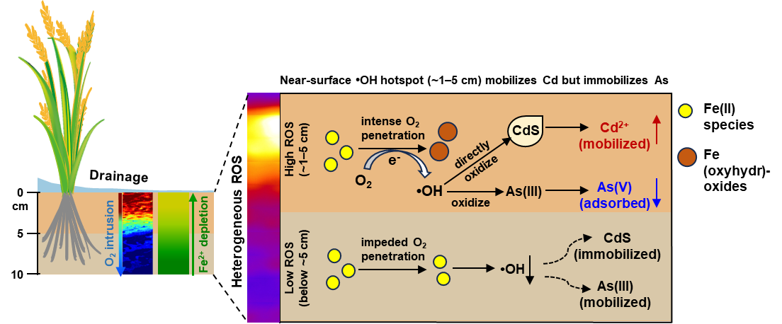 镉和砷是稻田中典型的有毒重金属与类金属,其环境行为强烈依赖于土壤氧化还原状态的动态变化。稻田淹水期镉因生成硫化镉沉淀而被固定,砷则因还原为三价形态而活性增强;排水期则相反—镉活化、砷氧化被吸附固定。然而,已有研究多集中于土壤整体的氧化还原变化,对于土壤垂直剖面中活性氧物种(如•OH)的空间分布及其对镉、砷行为的影响,仍不清楚。