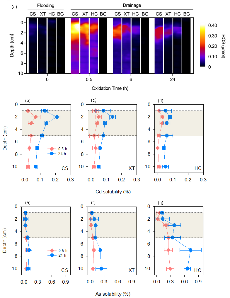 图1. 不同稻田土壤垂直空间形成的活性氧(•OH为主导类型)瞬时氧化锋面及其对镉、砷溶解度的影响