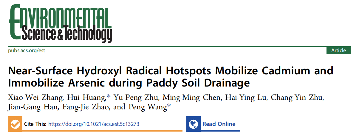 近日,南京农业大学汪鹏教授团队在环境领域期刊《Environmental Science & Technology》上发表题为“Near-Surface Hydroxyl Radical Hotspots Mobilize Cadmium and Immobilize Arsenic during Paddy Soil Drainage”的研究论文。该研究揭示了稻田排水过程中水土界面下方形成的羟基自由基(•OH)“热点”,能够同时促进镉的释放与抑制砷的迁移,为污染稻田中氧化还原敏感性元素的调控提供了新视角。